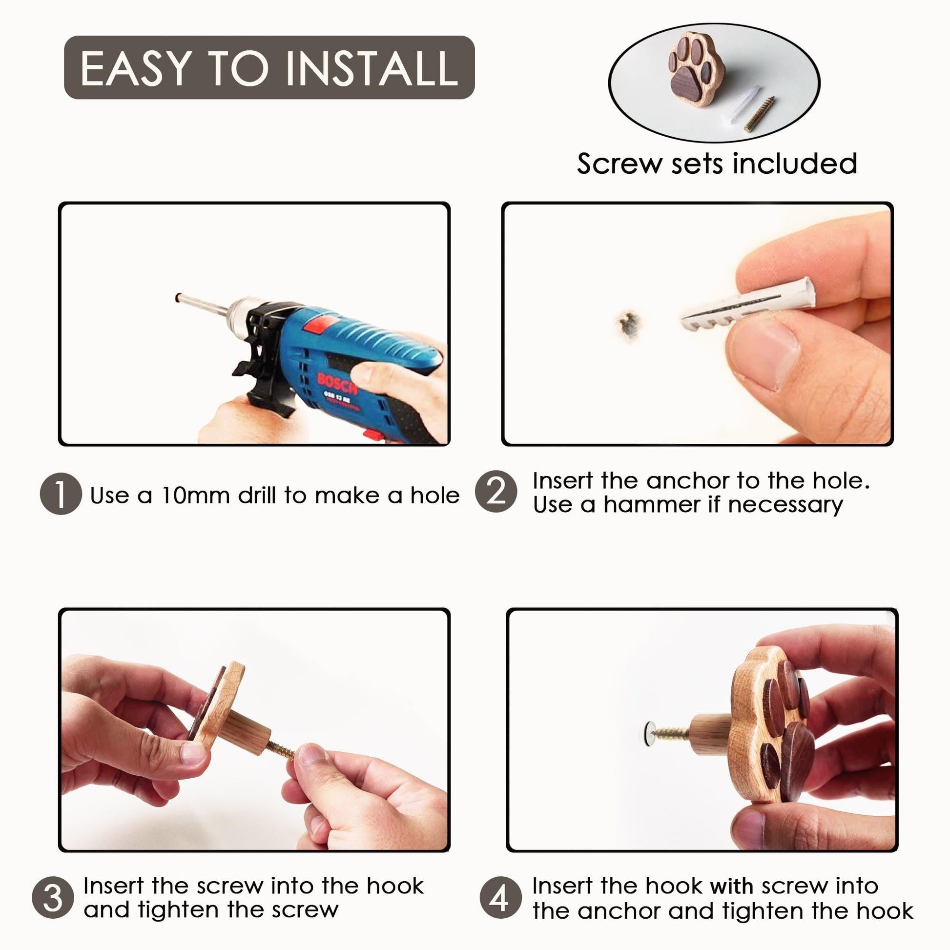 【EASY TO INSTALL】This wooden dog paw hook easily installs to most wall surfaces with provided screw and anchor sets.